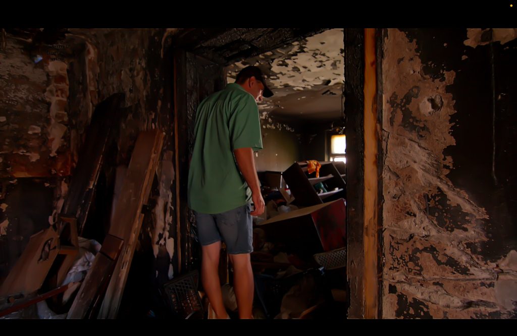 Înapoi în Piață, la două etaje deasupra antreprizelor noului scuar, miroase a tencuială arsă și a trecut. „Suntem în Piața Traian, o zonă foarte frumoasă, dar s-a întâmplat un incendiu la acest apartament. Acolo locuia bunica mea”, continuă, și-ntinde palma către etajul superior al casei ca spre un mormânt deschis. Cinci geamuri lipsă, nenumărați pereți afumați și mormane de lucruri pe post de podea. „A luat foc… de la o țigară. Avea haine multe, ținea hainele altora. Îi plăteau să le țină, ca într-un depozit.” „Aici a locuit bunica mea”, spune, în timp ce pășește cu capul plecat în ciuda coridoarelor înalte, și face turul casei trecute prin deflagrare. În pauzele dintre dialogul celor doi, se aud doar foșnetele și cârâitul încălțărilor pe obiecte lăsate acolo de cine știe când. „De aici a început focul. Nu s-a mai putut salva nimic. Mamă, ce-i aici.”